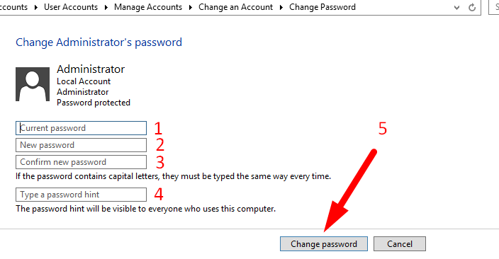 Agora clique em Change password. Pronto! Você agora você já sabe como alterar a senha de usuário do seu Windows Server. E caso preferir, a alteração também pode ser feita pelo painel de usuário da hospedagem de sites.