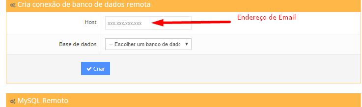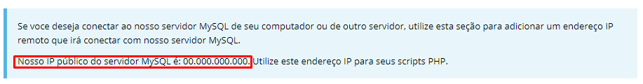 Importante! As conexões remotas também exigem que você use um IP específico para se conectar aos seus bancos de dados ou seu MySQL host não irá funcionará. Para descobrir o IP que você deve procurar o texto "Nosso IP público do servidor MySQL é:" no topo da página do MySQL Remoto: