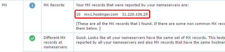 No valor "MX Records" você deve ver “mx1.hostinger.com”. Se estiver um valor diferente, você precisará alterá-lo no Painel de Controle do seu site, no menu “Editar MX Records”. Você pode facilmente restaurar seus registros MX Records para os padrões e tudo deverá voltar a funcionar normalmente nas próximas 24 horas.