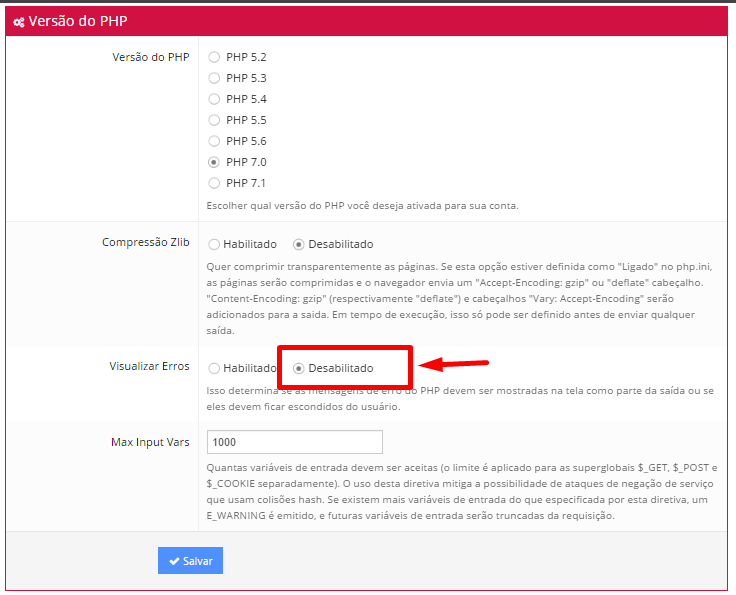 Você também pode desligar as mensagens de erro do php ao acessar a área do usuário -> Painel de controle de hospedagem -> Configuração do PHP, escolha Desabilitado para visualizar erros.