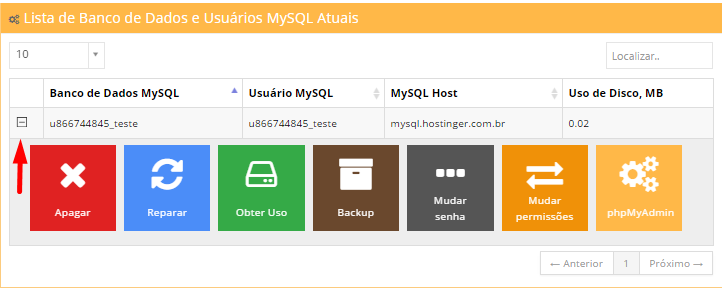 Você verá uma Lista de seus bancos de dados atuais. Clicando em Enter phpMyAdmin ao lado do banco de dados que você deseja acessar, irá levá-lo automaticamente para os bancos de dados phpMyAdmin, nenhum nome de usuário ou senha são necessários para entrar.