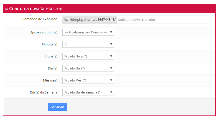 Na seção "Criar uma nova tarefa cron", você pode configurar para executar um script PHP em sua programação personalizada.