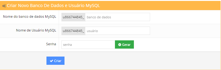 Ao usar o formulário Criar Novo Banco De Dados e Usuário MySQL, você pode facilmente criar um banco de dados, bem como um usuário que lhe será atribuído. Por padrão, o usuário terá todas as permissões. Usar a opção Gerar ao lado do campo de senha é altamente recomendado para uma senha mais segura.