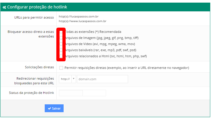Na seção "Configurar proteção de hotlink", você pode configurar a proteção de recursos do seu site. Você pode bloquear qualquer acesso aos recursos do seu site ou apenas tipos de arquivos específicos (vídeos, imagens, downloads e etc.). Você também pode negar acesso direto (isso é ótimo se você não deseja que seus visitantes liguem suas imagens especificamente, em vez disso, eles seriam obrigados a compartilhar a página em sí e não apenas a imagem). Usando o Redirecionar requisições bloqueadas para esta URL, você pode redirecionar todos os visitantes tentando acessar seus recursos para uma página específica, por exemplo, uma página de erro. Certifique-se de definir o status da proteção Hotlink como Ativado também.