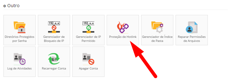 O recurso Proteção de Hotlink bloqueia outros sites e visitantes acessarem diretamente o link de arquivos e imagens em seu site. Para começar a proteger os recursos do seu site, vá até o painel de controle da sua conta de hospedagem e localize o menu Proteção do Hotlink.