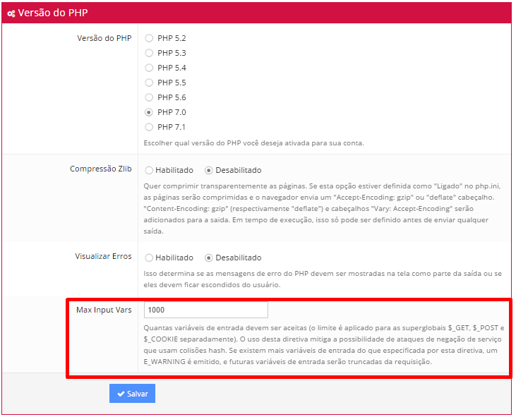 Uma nova página será aberta contendo as configurações do PHP da sua conta. Defina o valor que deseja usar no último campo chamado Max Input Vars e clique em Salvar.