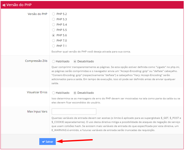 Na página recém aberta, você pode selecionar a versão PHP que deseja usar com sua Conta. Escolha a versão necessária do PHP e clique em Salvar na parte inferior da página.