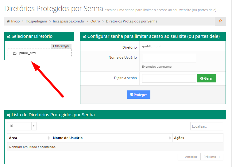 Na seção "Selecionar Diretório", você pode selecionar o diretório que deseja proteger, já na seção "Configurar senha para limitar acesso ao seu site (ou partes dele)", você pode escolher um nome de usuário e uma senha para o diretório.