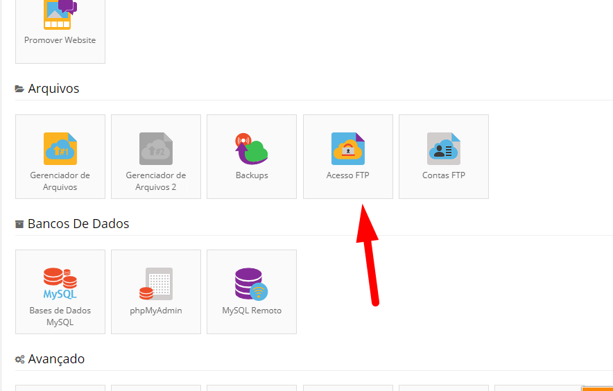 Primeiro, acesse seu painel de controle. No painel de controle da sua conta, procure pelo menu Acesso FTP.