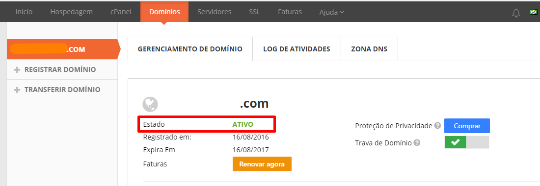 Se você adquiriu o nome de domínio errado por engano ou mudou de ideia e se o seu Status de pedido de domínio ainda não está definido para Ativo, pode contatar-nos através do nosso bate-papo ao vivo ou enviar um ticket de suporte na seção de Ajuda para registrar um registro de domínio diferente. Se o domínio já estiver ativo, ele não poderá ser alterado. Para ver se o status do seu domínio está ativo, vá até o seu perfil da Hostinger e clique em Domínios. Selecione seu domínio e verifique o status.