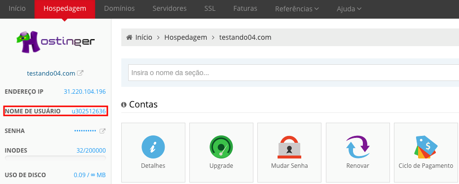 Para encontrar o seu nome de usuário, entre em https://cpanel.hostinger.com.br/ e escolha sua conta de hospedagem. Seu nome de usuário estará na parte superior do painel de controle, no lado esquerdo.