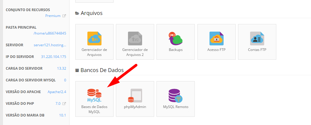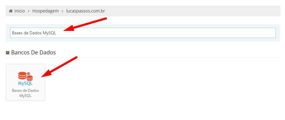 Como alternativa, você pode usar a Barra de Pesquisa para encontrar a seção Base de Dados MySQL.