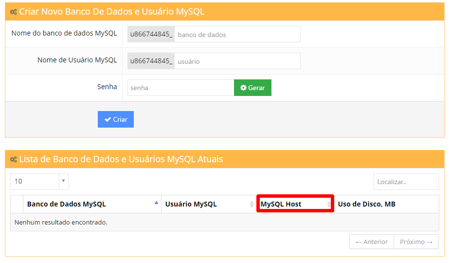 Se sua Lista de Bases de Dados MySQL estiver vazia, primeiro você deve criar um Banco de Dados e uma usuário MySQL.